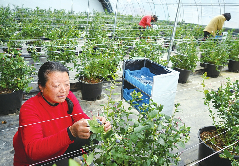 圖③:工人在陽高縣藍莓產業示范園採摘藍莓。