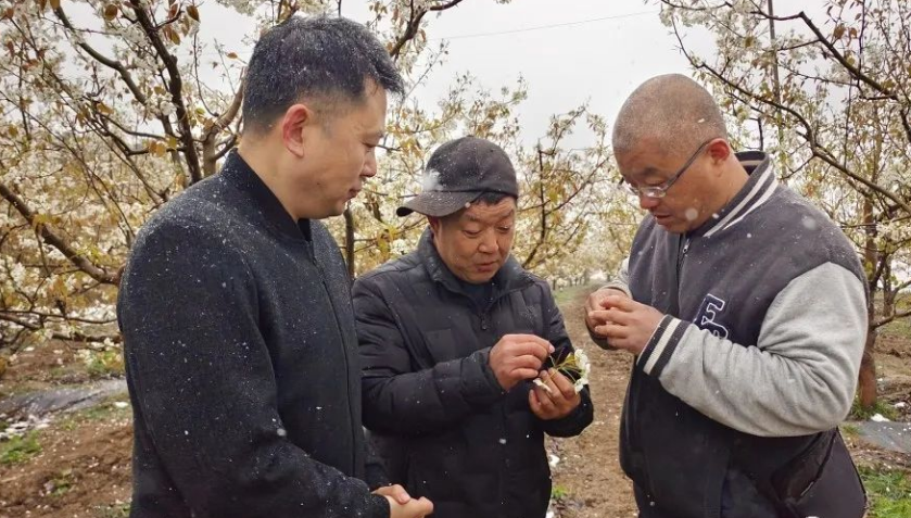 技術人員還來到富家溝的玉露香梨“嗨翻甜”農場,指導果農及時把控雨雪降溫天氣對梨樹的影響。