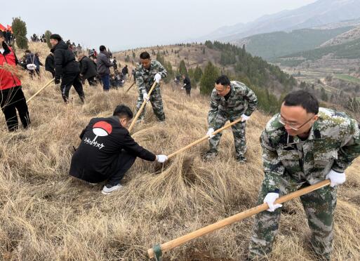 植樹現場,黨員先鋒模范紅旗高高飄揚,大家齊心協力、干勁十足,奮力傳承全國道德文明提名獎高文毓老先生留下的信念堅定、艱苦奮斗、無私奉獻的《綠山夢》精神。有的揮鍬鏟土,有的扶樹正苗,有的培實新土……有條不紊地完成植樹各個工序。經過一上午的共同努力,3000余株側柏和連翹穩穩扎根土壤,在春風中昂然挺立,煥發出勃勃生機。