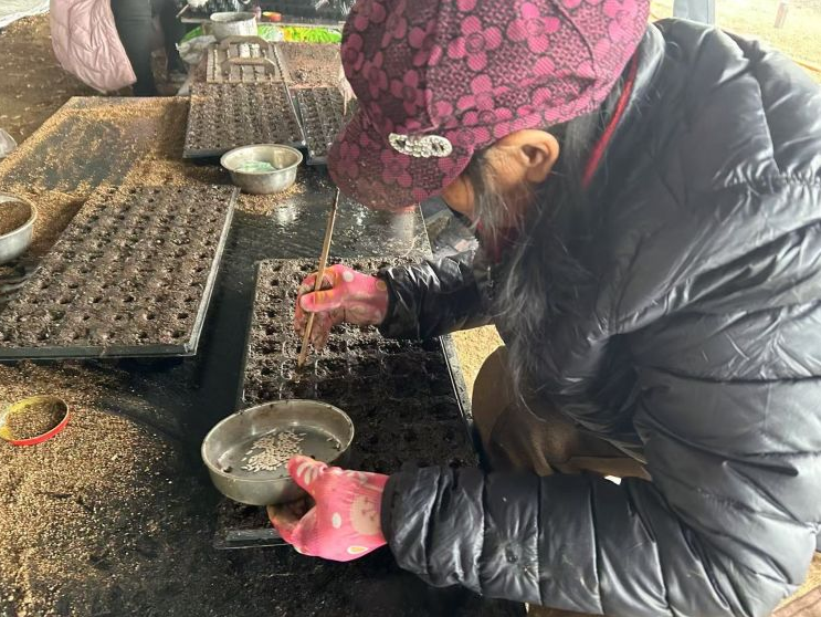 在大棚內,擁有豐富種植經驗的村民們有條不紊的將翻土、營養基質裝盤、甜瓜種子點入穴盤、蓋土、封保溫膜......5個作業依次進行。這是播種的第一步工作。