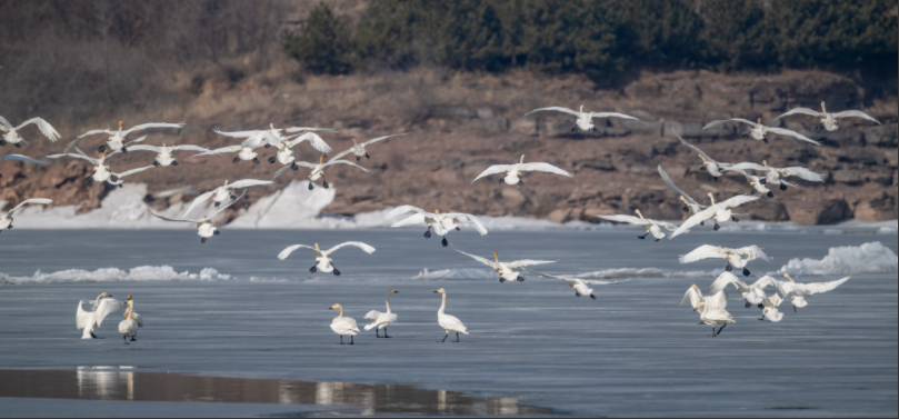 此時,一群天鵝緩緩降臨,它們身披潔白的羽毛,如同天空中最純淨的雲朵,輕盈地漂浮在碧波之上。天鵝們時而低飛掠過水面,翅膀輕輕拍打,激起一圈圈漣漪,仿佛在與水面進行一場無聲的對話﹔時而優雅地游弋,身姿曼妙,與清澈的水面交相輝映,構成了一幅動人心魄的山水畫卷。