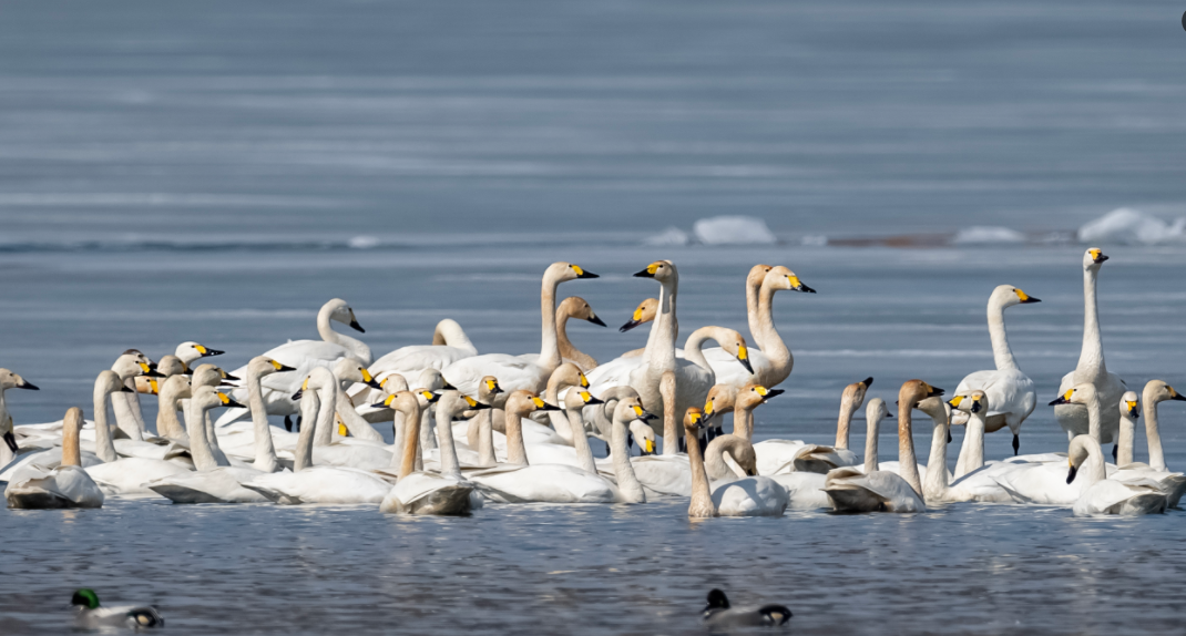 陽光透過雲層,洒在水面上,為天鵝們披上了一層金色的光輝,更添幾分神秘與仙氣。水庫四周,山巒起伏,春色泛起,與天鵝的潔白羽毛相映成趣,仿佛是大自然最精心的布局,讓人沉醉其中,流連忘返。