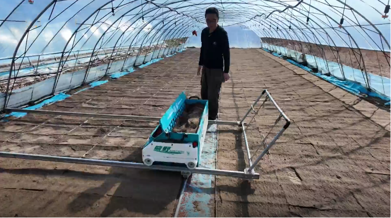 大棚內,一台水稻精播機來回游走,先均勻撒下稻種,隨后覆上細土。一個人操作一台精播機,不一會兒,一個大棚的水稻育苗工作就全部完成。