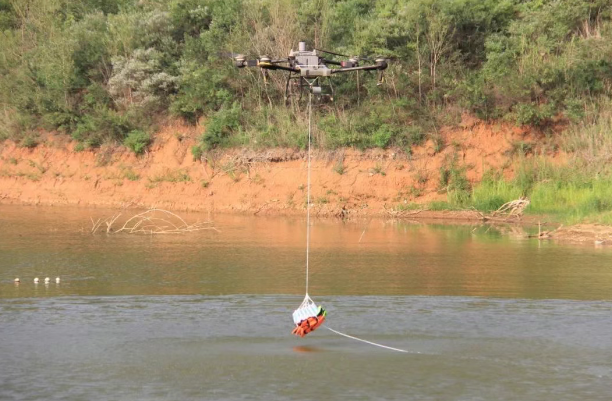 救援無人機急速飛抵落水點上空,根據“慣性拋投技術”,無人機在急速升降中利用重力慣性自動解開繩結,將救生衣、飲用水等物資精准投送至落水者身旁,並為落水者提供浮力支撐,以協助其安全返回岸邊。