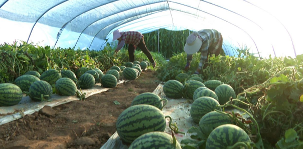 農戶在瓜棚收獲西瓜