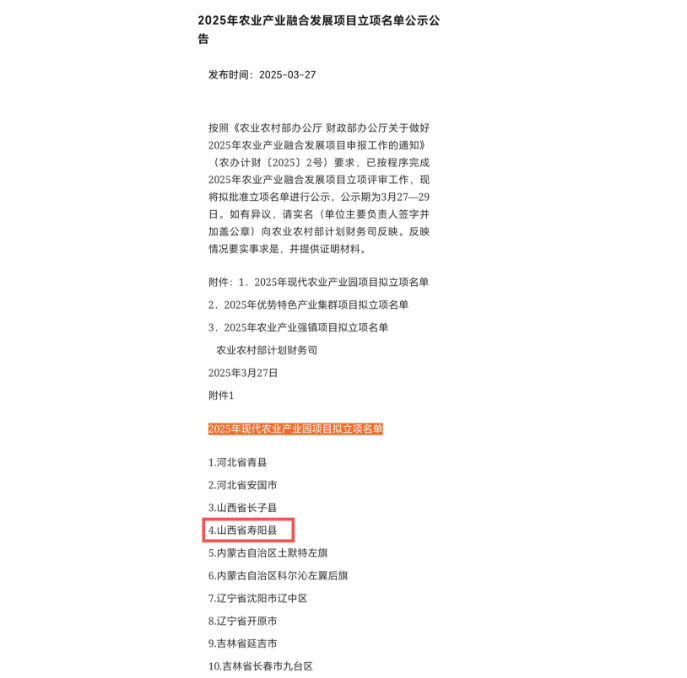 山西新聞網三農頻道訊 今年以來,壽陽縣持續深化實施百項爭創工程,全縣上下以“開局就是決戰、起步就是沖刺”的奮進姿態,全力以赴爭品牌、爭試點、爭資金,截至目前已爭取到多項國省級品牌榮譽及資金,為增強發展硬實力、實現首季“開門紅”提供了有力支撐。 近日,在農業農村部計劃財務司發布的《2025年農業產業融合發展項目立項名單公示公告》中,公布了2025年50個國家現代農業產業園項目擬立項名單,壽陽縣作為山西僅有的兩個縣之一成功入選。