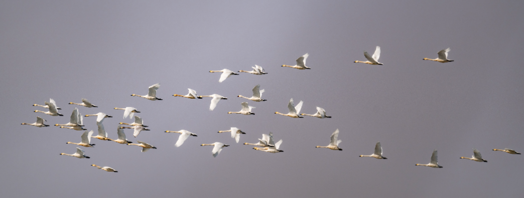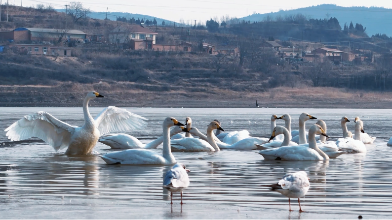 山西新聞網三農頻道訊 今年,昔陽縣郭庄水庫首批天鵝的抵達時間比以往提早了半個月,為冬日仍帶寒意的水庫增添了一抹難得的生機。這些優雅的大天鵝,在尚存冰面的廣闊水域中自由嬉戲,與數百隻野鴨共同譜寫著生態多樣性的贊歌。