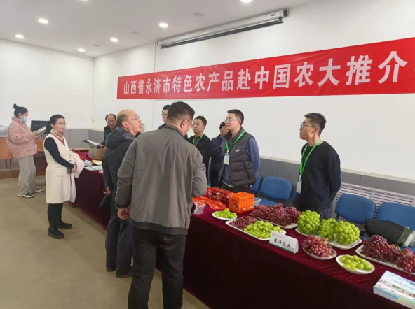 山西新聞網三農頻道訊 11月22日,永濟市2023年農業領域人才國情研修班在中國農業大學舉辦期間,為充分展示永濟市特色農產品發展成果,擴大品牌影響力和美譽度,永濟市農業農村局精心組織涉農企業在中國農業大學繼續教育學院第四報告廳舉辦農產品推介活動,集中展示了克倫生葡萄、陽光玫瑰葡萄,特色面食醬料、小麥胚芽、精制面粉、柿子酒等6大類近20種特色農產品。 活動現場,參觀品鑒者絡繹不絕,來自中國農大的教授們在品嘗永濟市的優質葡萄后,詳細了解了品種優勢、管理方法、種植規模、產品包裝、銷售價格及供應市場等情況,對品質優良、味道鮮美的葡萄贊譽不絕,紛紛提出購買意願。