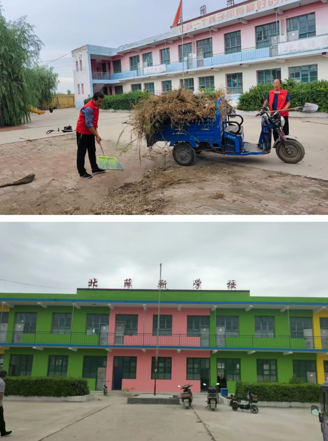 “亮”招煥新促提升。8月初,對北薛靳小學教學樓進行了外牆保溫、室內外粉刷等。臨近開學,村“兩委”組織20余名志願者對北薛靳小學周邊環境衛生進行徹底整治,清理雜草、修剪綠植、轉運垃圾、清潔教室等,為孩子們創造了一個更加優美、整潔的學習環境。
