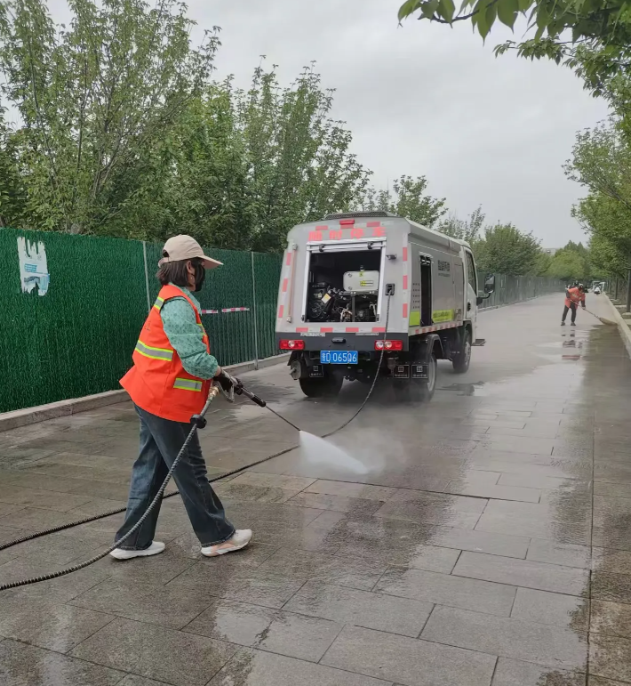 在市民廣場消防通道,環衛工人們採用 “人工 + 機械”協同作業模式,對衛生死角進行深度清掃,利用高壓沖洗設備對路面頑固污漬進行全方位沖洗,並及時轉運積存垃圾,確保消防通道環境干淨整潔,筑牢安全與衛生雙重防線。針對夜經濟區,環衛中心重點開展路面油污清洗和設施消毒作業,對主次街道下水道口、垃圾桶、垃圾分類亭等進行集中清理,每日兩次噴洒消毒,有效提升重點區域環境衛生質量,為夜間消費活動保駕護航。?