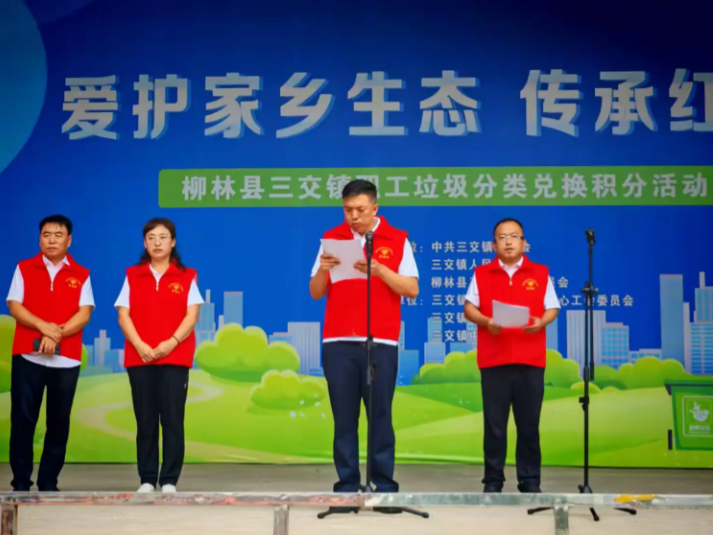 為深入推進農村人居環境整治提升,激發群眾參與垃圾分類的內生動力,8月4日上午,柳林縣三交鎮黨委在鎮黃河劇場舉行職工垃圾分類兌換積分活動啟動儀式。鎮黨委書記張勇、鎮長賈晉文等領導班子成員,全體機關干部,鎮直各單位、各村“兩委”負責人,環衛工人共計130余人參加儀式。