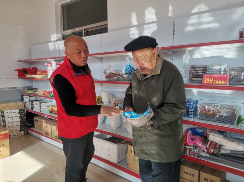 山西新聞網三農頻道訊 洗衣粉、香皂、笤帚、毛巾等日常生活品整整齊齊地擺放在貨架上,一旁從10分到50分不等的積分牌子對應擺放。牆面上,積分事項、評分標准一目了然。