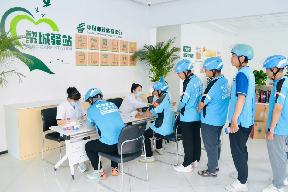 7月16日上午,黎城縣委社會工作部聯合縣委組織部、縣衛健局在黎城驛站(郵政儲蓄銀行站)開展“關愛健康”“送清涼”等系列服務活動。活動邀請縣中醫院的醫護人員為外賣小哥、環衛工人等戶外工作者免費提供測量血壓、血糖等健康體檢服務,並為他們送去防暑藥品、礦泉水、西瓜等降暑物品。