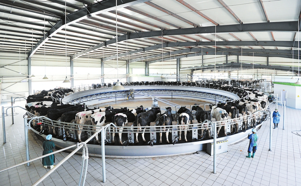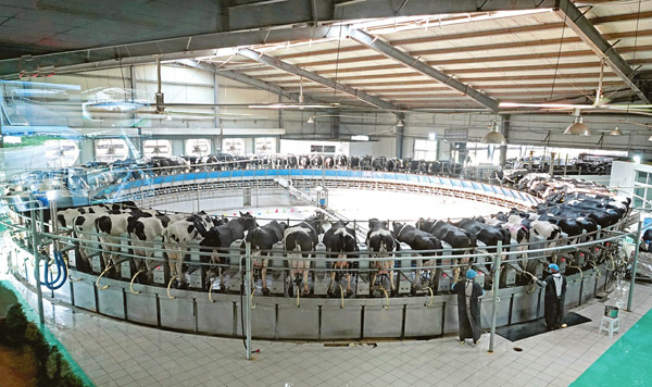 7月8日,大同市天鎮縣中地生態牧場有限公司擠奶車間,工人正在操作轉盤式擠奶機採收鮮奶。該公司帶動附近3個村1200戶農民種植青貯玉米近2萬畝,就近解決奶牛飼草料供應,每戶年均增收5000元,實現貧困戶、企業共同受益的良性循環。