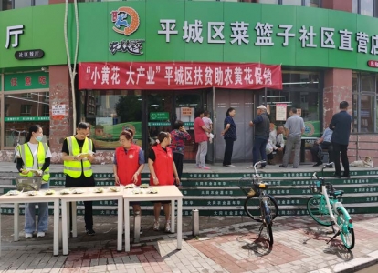 平誠農業公司助銷黃花,幫助農民增收。 孫露攝 本報訊(記者 孫露)“鮮黃花隻要用沸水焯一下,或者上鍋蒸一下,即可涼拌、素炒、肉炒等……”連日來,大同市平誠農業產業發展有限公司依托農業嘉年華菜籃子社區直營店,開展“識黃花 摘黃花 食黃花”推廣促銷活動,以此助力大同黃花產業做大做強,助力雲州區農民增收致富。