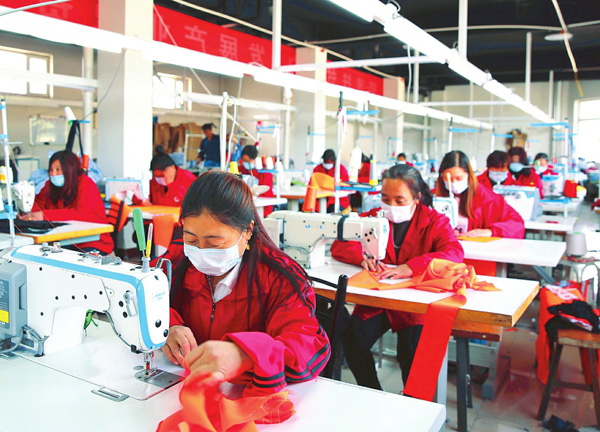 8月5日,方山縣圪洞鎮盛祥安居苑易地扶貧搬遷安置點扶貧車間,婦女們正在勞作。該車間解決了安置區和周邊村庄七十余名婦女就業,每人每月工資近兩千元。