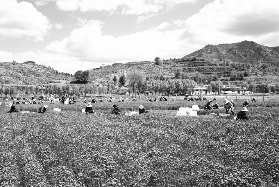 驕陽似火,也比不過晉城市陽城縣北留鎮頭南村鄉親們增收的熱情。 6月9日,記者看到,在千畝連翹田間,二十余位頭戴斗笠的村民們正頂著烈日、彎著腰在田間鋤草,悉心呵護著金絲皇菊幼苗,一株株幼苗經過他們的手,整整齊齊地在壟間“列隊”、萌芽待發。