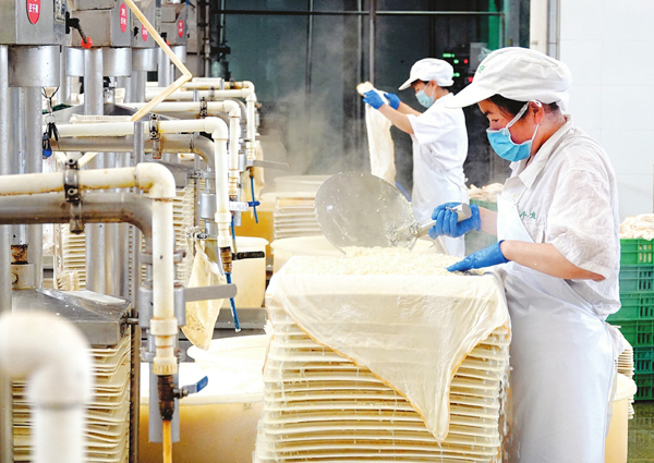 6月8日,在長治市胖妞食品有限公司豆制品生產車間,工人們正在各個崗位上緊張有序忙碌著。一直以來,該公司堅持以科學、安全、健康為理念,在科技研發、生產加工、市場營銷等領域不斷壯大企業發展路徑。