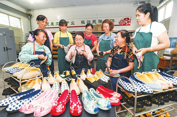 6月12日,在臨汾市堯都區土圪塔布鞋有限公司“巧手扶貧車間”,技術人員在一起交流納鞋底的技術經驗。“巧手扶貧車間”除採用車間加工外,還將布鞋原材料、技術送進建檔立卡貧困戶和留守婦女家中,並派技術員上門進行指導、回收產品和驗收付款,探索出了一條“送崗上門、就近就業、巧手脫貧”的致富新路子。