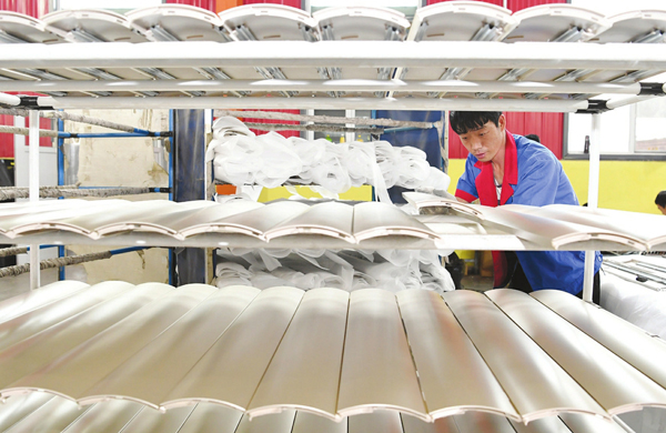 6月21日,榆社縣山西森宏服裝有限公司的生產線上,工人們正在精心制作服裝。 該公司現擁有3個扶貧車間,有裁剪、繡花、印花、縫紉、后整5條生產線,主要生產運動服、工作服、校服等系列服裝,產品遠銷歐洲、北美、南美、中東、東南亞等國際市場。