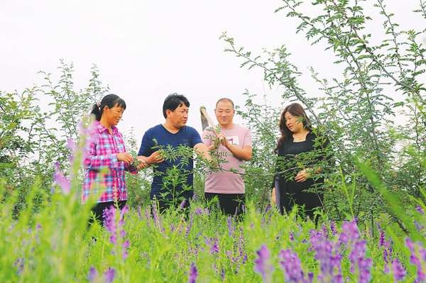 6月28日,夏縣廟前鎮西村村干部和村民正在查看花椒和黃芩藥材病虫害防治情況。該村氣候適宜多種農作物生長,在旱坡地創下了花椒藥材立體種植畝效益達八千多元的歷史紀錄,促進了農民增收。