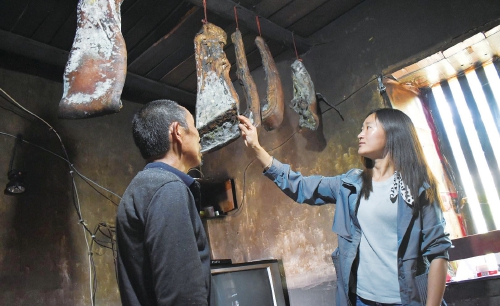 劉迪敏(右)在村民李正玉家中收購臘肉。 近日,筆者走進鄂渝邊界的湖北省建始縣長梁鎮江家埡村,遇見劉迪敏正在村民李正玉家中收購臘肉。