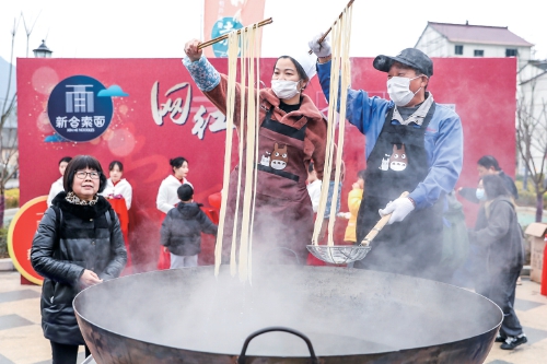 日前,在浙江省杭州市桐廬縣新合鄉引坑村,制作索面的農戶現場展示技藝。近年來,新合鄉採取“黨支部+合作社+農戶”發展方式,通過注冊“新合索面”商標、改良產品工序包裝等舉措,創新發展索面產業。