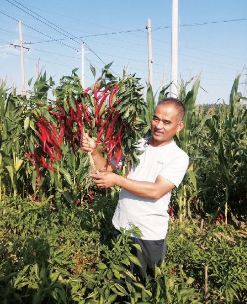 樂陵市楊安鎮王屯村種植大戶張國軍展示他種植的辣椒。 “2行玉米間作6行辣椒,辣椒不減產,玉米是白揀,每畝可收獲鮮椒3000-3500公斤,玉米200公斤左右。