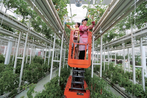 近年來,江蘇省連雲港市海州區浦南鎮大力建設現代農業園區,建成日光溫室大棚5000余棟,年產蔬菜達25萬噸,為當地農民增收開辟了途徑。圖為近日,園區員工正在智慧農業體驗中心採摘立體栽植的辣椒。