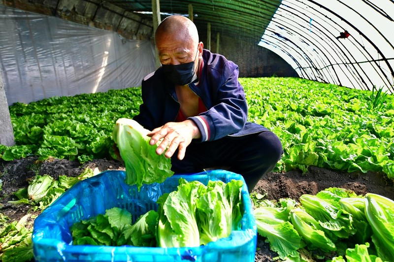 近期,太原市在做好新冠肺炎疫情防控的前提下,積極開展農業生產。圖為2月19日,太原市晉源區晉祠鎮南張村的村民在大棚裡採收生菜。