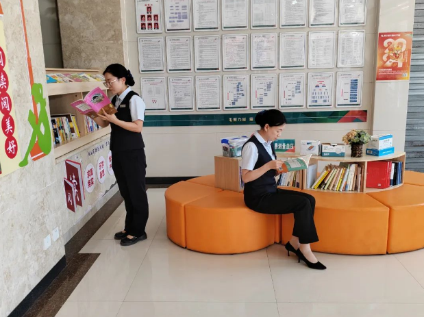青年理論學習小組以“世界讀書日”為契機,組織員工共同走進網點開辟的讀書角,員工在書架上挑選自己感興趣的書籍,利用碎片時間,翻看一本喜歡的書,共同探討書中的樂趣,讓書香飄滿整個營業廳。