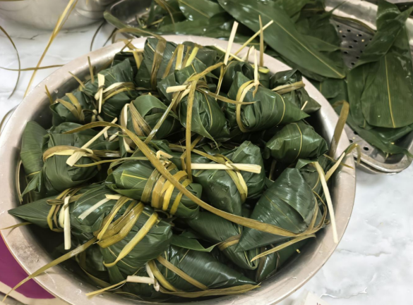 包粽子活動中,大家以“粽”為媒,圍繞黨建聯建、社區安全等話題開展了互動交流。桌子上整齊地擺著粽葉、糯米、蜜棗、紅豆和扎繩等必備材料。手法嫻熟的志願者大姐們手把手地教大家捋粽葉、做漏斗狀、填糯米、壓緊實、封口、扎捆……原本不太熟練的新手們動作從生疏到熟練,很快就學會了包粽子技能,一個個形態各異卻飽含心意的粽子便呈現在眼前。