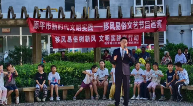 為深入推進移風易俗工作,弘揚文明新風,8月25日下午,原平市南城街道教育路社區新時代文明實踐站在軍興家苑舉辦移風易俗文藝演出活動,以群眾喜聞樂見的藝術形式,將文明理念傳遞到千家萬戶。 活動前期,工作人員通過社區公告、居民微信群等渠道提前宣傳,明確演出時間、地點及節目亮點,吸引眾多居民到場觀看。