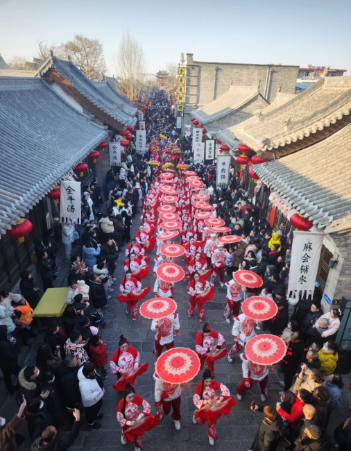 隨著歡快的鑼鼓聲響起,演出在忻州古城南北大街拉開帷幕。秧歌隊身著鮮艷的服飾,手持彩扇,在街頭巷尾翩翩起舞,他們步伐輕盈,舞姿優美,將傳統秧歌的韻味展現得淋漓盡致。雜耍隊同樣盛裝出席、熱情飽滿,表演了跑旱船、耍毛驢、抬轎子等帶有濃郁地方特色的節目,並與觀眾近距離互動,讓觀眾親身感受非遺文化的魅力。許多觀眾紛紛駐足觀看,拿出手機記錄精彩瞬間。