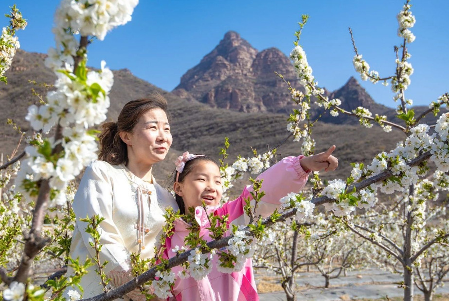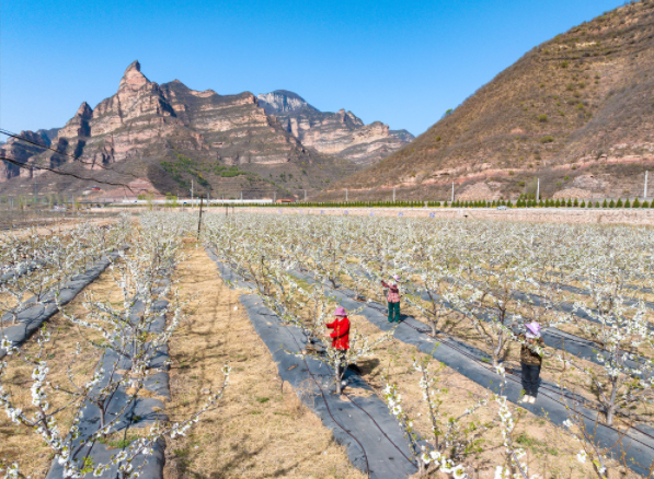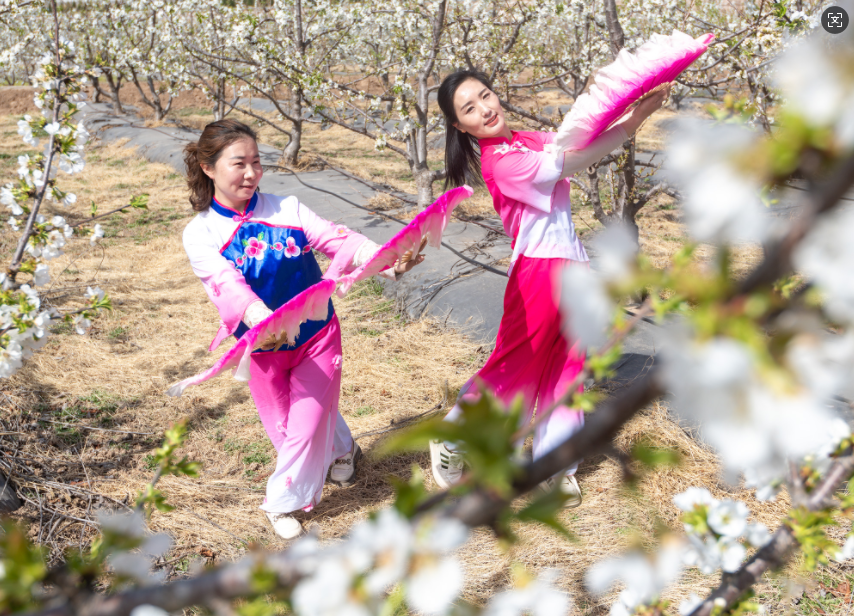 果農們穿梭其間,忙著疏花、吊袋,為豐收精心籌備;游客們紛至沓來,沉醉於花海,拍照打卡。身著傳統服飾的村民在花間翩翩起舞,跳起左權小花戲,為春日增添別樣韻味。