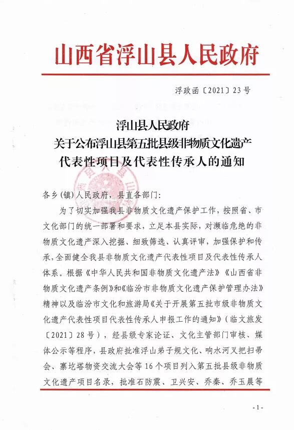 為進一步推動全縣非物質文化遺產陣地建設,根據《中華人民共和國非物質文化遺產法》《山西省非物質文化遺產條例》和《臨汾市非物質文化遺產保護管理辦法》及《關於開展第五批市級非物質文化遺產代表性項目代表性傳承人申報工作的通知》,通過縣級專家論証、文化主管部門審核、媒體公示等程序,縣政府批准浮山弟子規文化等16個項目列入第五批縣級非物質文化遺產項目名錄。