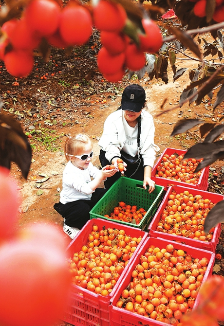 10月18日,一名小朋友和家長在永濟市城西街道庄子村採摘柿子。金秋時節,該市春蕾幼兒園組織家長帶領孩子深入田間地頭,進行親子採摘活動,近距離欣賞金秋美景,感受豐收帶來的喜悅。