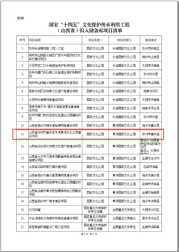 山西新聞網三農頻道訊 建設國家文化公園,是推動新時代文化繁榮發展的重大工程。8月11日,山西省發改委發布的《關於我省擬列入國家“十四五”文化保護傳承利用工程儲備庫項目的公示》中,偏關縣老牛灣黃河文化公園建設項目入選其中,這是偏關縣繼2020年老牛灣—平型關長城風景道成為全國45個省級重點項目之一的又一喜訊。