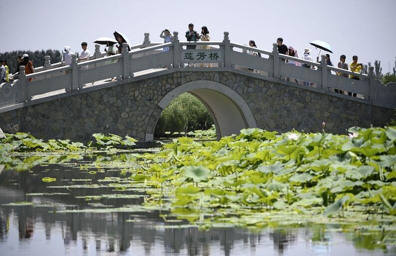 近日,位於寧夏銀川市興慶區的鳴翠湖國家濕地公園荷花競相開放,吸引眾多游客前來賞花、避暑。圖為游客在鳴翠湖國家濕地公園游玩、賞荷(7月3日攝)。