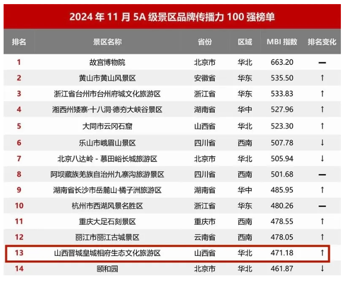 山西新聞網三農頻道訊 邁點研究院獨家發布的2024年11月5A級景區品牌傳播力100強榜單新鮮出爐,皇城相府生態文化旅游區名列5A景區品牌100強第 13 名。 此外,邁點還發布了11月5A級景區區域榜單TOP10,皇城相府生態文化旅游區位列華北地區榜單第4名。