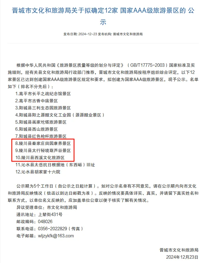 山西新聞網三農頻道訊 12月23日,晉城市文化和旅游局對擬確定的12家國家AAA級旅游景區進行公示,其中,陵川縣3家入選,分別是陵川縣秦家庄田園康養景區、陵川縣太行秘境葫蘆谷景區、陵川縣西溪文化旅游區。 (翟宇航)。