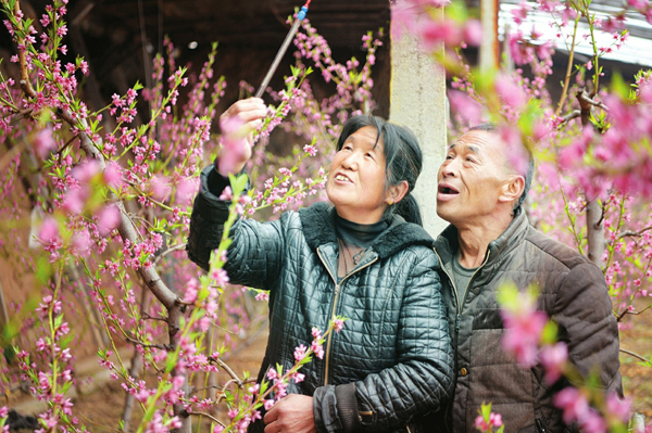 2月25日,古縣古陽鎮白素村的油桃基地裡春意盎然,桃花朵朵盛開,美不勝收。圖為果農正在查看大棚室內溫度。