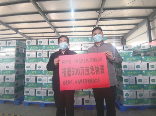 圖為黨永富代表河南遠東生物工程公司向河南省老區建設基金會捐贈價值600萬元的農業應急物資。 受新冠肺炎疫情影響,河南部分區域的小麥錯過了最佳施肥農時,小麥處於“半飢餓”狀態。