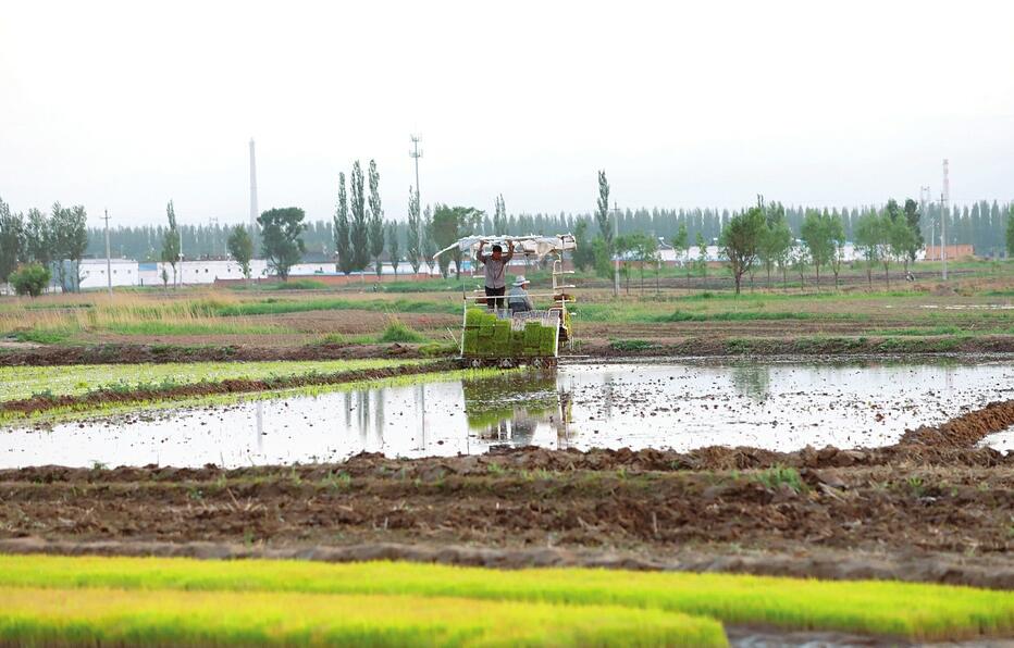 5月23日,原平市新原鄉大庫狄村村民正在使用插秧機插秧,千畝稻田裡機聲隆隆,一派繁忙景象。眼下正是當地水稻插秧的時節,原平市滹沱河沿岸調整種植結構后的農田裡秧苗青翠欲滴、生機勃勃。