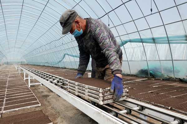 生產線旁的稻農正有條不紊地分工作業 本報訊 4月11日上午,在太原市晉源區晉祠鎮花塔村稻田公園附近的育秧大棚內,一條自動化育秧生產線正不停運轉,生產線旁的稻農正有條不紊地分工作業。育秧盤進入育秧機經過播施底土、噴淋給水、播撒種子、覆蓋浮土后,通過傳輸軌道被送至棚內,由稻農整齊擺放在地上。