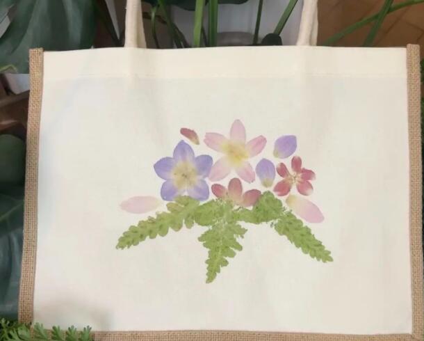 活动开场,老师为大家讲解了植物拓染的方法、材料以及操作过程和注意事项,利用落花落叶等植物原材料,通过敲击萃取汁液在纤维材料上染色,并现场为大家演示:从浸泡固色过的植物中挑选出自己喜欢的花材,擦干后正面朝上,手动固定。大家小心翼翼地用纸巾擦干叶片和花瓣上的水分和浮土,在白色布包上摆放排列,搭配色彩,以布为纸,以叶作画,喜欢素雅的只用绿叶点缀,偏爱热烈鲜妍的包面上则一片花团锦簇。“树叶可以摆放成什么图案呢?”“可以成列排开,也可以搭配花瓣!”“这是我自己做的2024春夏高定版手作包!”不同的拼搭组合浮现了花与叶不同的美丽姿态,每个人都有自己的“淡妆浓抹总相宜”。