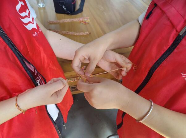 在此次活动中,志愿者们也组织群众共同编织五彩绳,村民兴致勃勃地一边编织一边交流讨论,时不时请教志愿者编织技巧。随后,一个个精致小巧的五彩绳映入眼帘,现场充满了欢声笑语,其乐融融。每位群众手上都戴上了五彩绳手链,获得了健康、吉祥、平安的祝福,一条条承载满满祝福的五彩绳手链,串起了志愿者与群众的心。