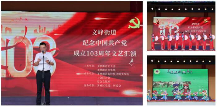 文艺汇演颂党恩,厚植爱党爱国情。 文峰街道举办庆祝中国共产党成立103周年文艺汇演,向伟大的党献上最诚挚的祝福。由社区居民自编自演14个精彩节目依次登场,展现出老、中、青、幼不同年龄段的居民对党、对祖国的祝福。表演精彩纷呈、引人入胜,带现场观众共诵心中赞歌,重温党的光辉历程。