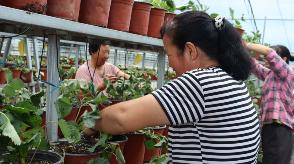 走进大棚,十几名工人正紧张有序地进行草莓苗移栽工作。只见大家分工明确,各负其责,运苗、移栽、浇水,动作娴熟且迅速地将一株株绿油油的幼苗小心翼翼移栽进盆里。