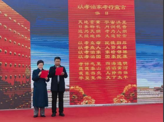 在欢天喜地的锣鼓声中 ,揭牌仪式在全体起立齐唱国歌中开启。接着, 与会人员一同观看了《以孝治家倡议书》《以孝治家十年成果》等专题片。